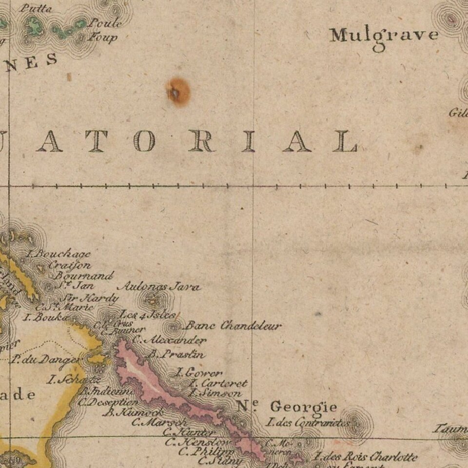 Australia is divided with the western portion named Nouvelle Hollande (New Holland) and the eastern portion named Nouveau Galles Meridionale ou Sijdnij Cove (New South Wales or Sydney Cove). Numerous placenames fill the coasts of Australia, which is depicted with a hypothetical coastline stretching from Western Port to St. Peters Island.