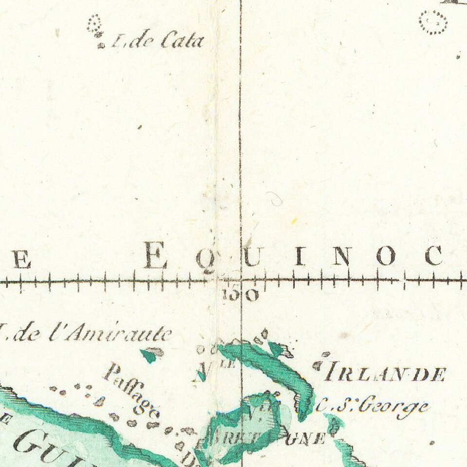 Distinctive features of the geography include the outline of Australia, which is connected to Tasmania, then known as Van Diemen’s Land. It would not be understood to be an island until after Matthew Flinders and George Bass circumnavigated the island in 1798-9.