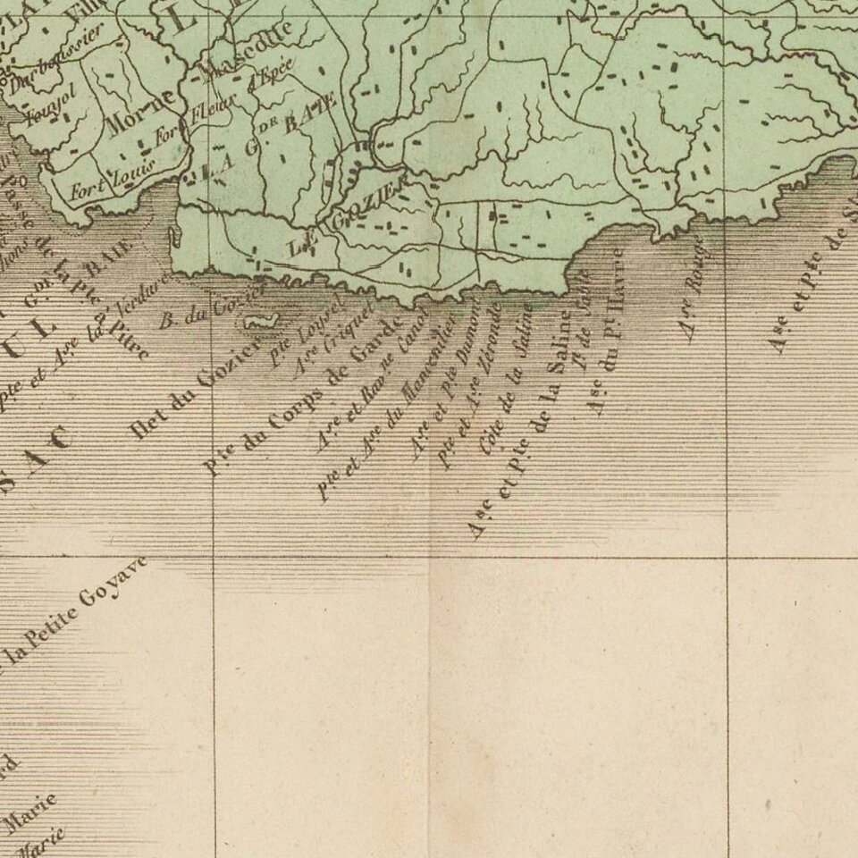 For geography, his most important contribution was publication of the French edition of Carey & Lea’s American Atlas in 1825. Each page of the atlas includes highly detailed text about the state or territory depicted, as well as a map of the area. The French edition is generally considered in high regard as compared to other editions, as it has quality paper and superior engraving.