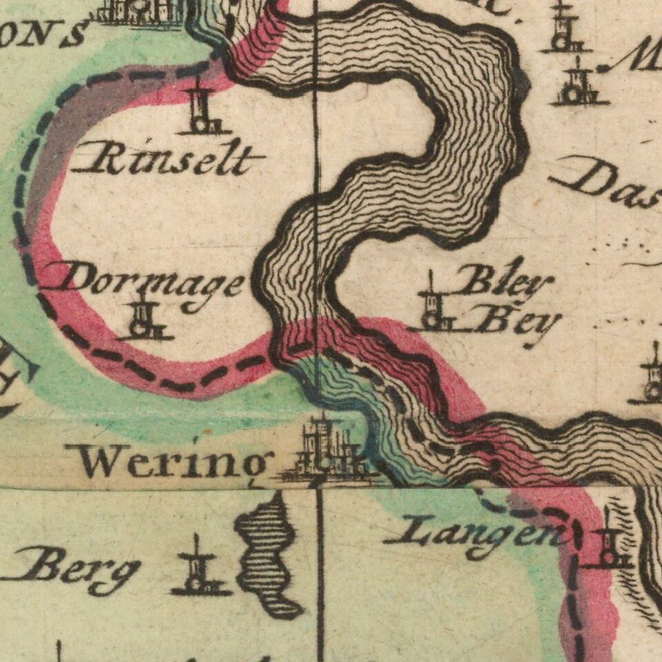 Detailed map the course of the Rhine River, from the Wesel area in the Duche of Cleves to Coblentz.