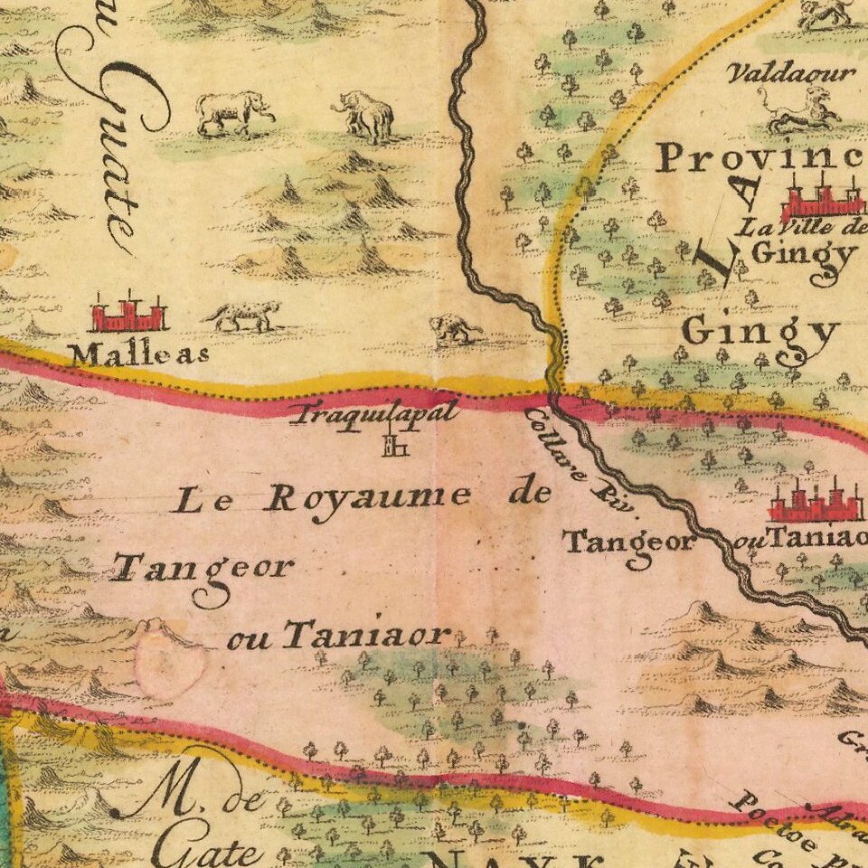 The map includes three text boxes giving particulars of the region and its divisions. Interior details include the Western Ghats and wild animals among the forests and hills. After a map by H. Reland (1676-1718) a Utrecht professor who specialized in Asian languages, geography and religions.