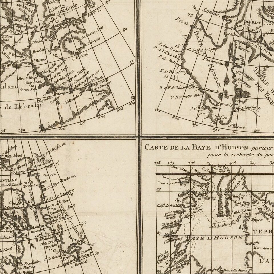 Marvelous set of four maps of the Hudson, Button and Baffin Bay regions, Davis Straits, and the Coast Labrador, as developed and explored between 1650 and 1750.