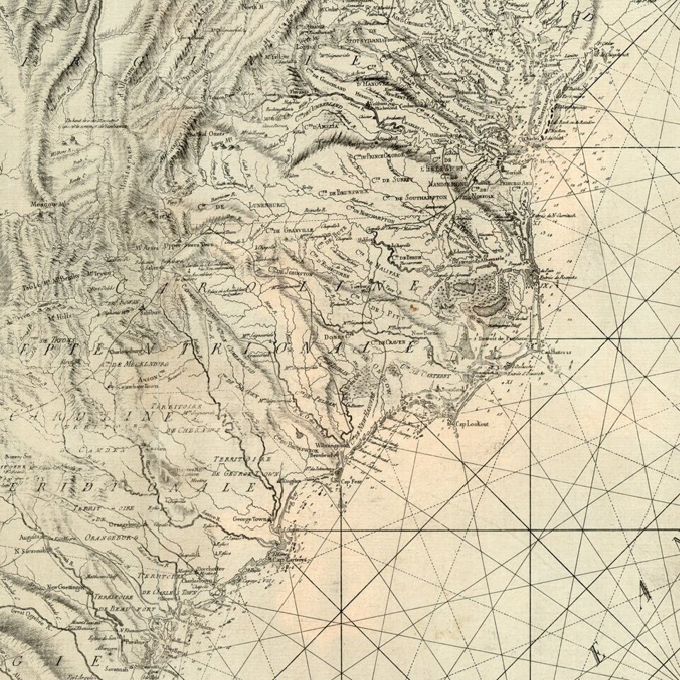 While at first blush, the map appears to be a coast chart, in fact, its charm lies as much for what it shows in the interior parts of Maryland, Virginia, the Carolinas and Georgia. The map includes dozens of early roads, forts and towns, as well as excellent detail in locating the various Indian Lands east of the Appalachians.