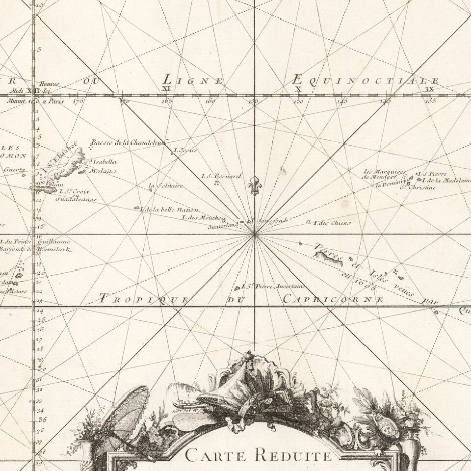 The chart therefore depicts the Pacific just before the explorers John Byron, Louis-Antoine de Bougainville, Samuel Wallis, Philip Carteret, and James Cook began to answer many of the geographic questions raised in this chart. What was the relationship of Van Diemen’s Land to the mainland? Were New Guinea and Australia connected? Where was Quiros’ Terre du S. Espirit and how did it relate to other nearby islands?