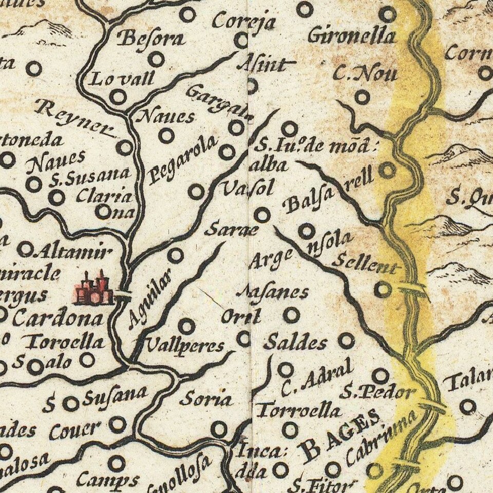 Old color example of Blaeu's map of Catalonia, extending from C. De Romani on the Northern Coast to Alfachs and Panicola in Valencia on the southern end of the coast and showing the entirety of Catalonia in tremendous detail.