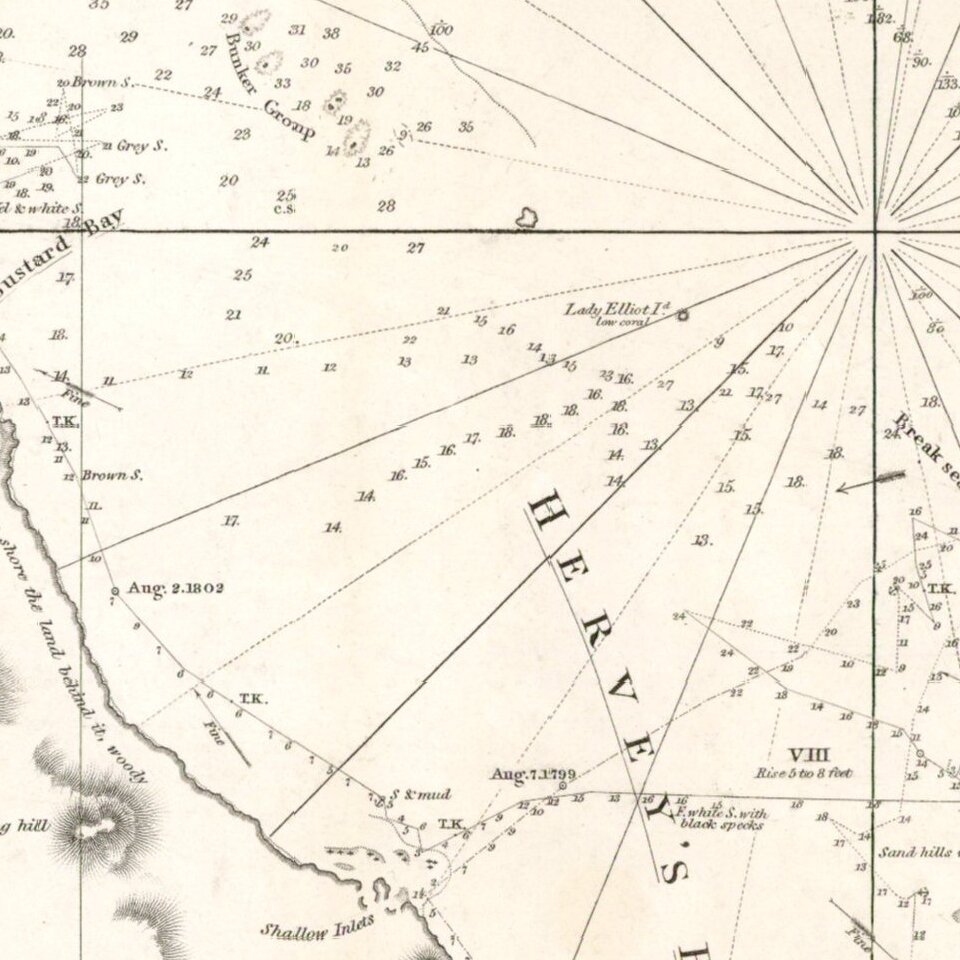 The chart is based upon the surveys of Matthew Flinders, between 1799 and 1803, including the tracks of his ship the Investigator through the region. The chart also includes revisions based upon later explorations by Captains Phillip P. King (1826), F.P Blackwood (1844) and Captain O Stanley (1847).