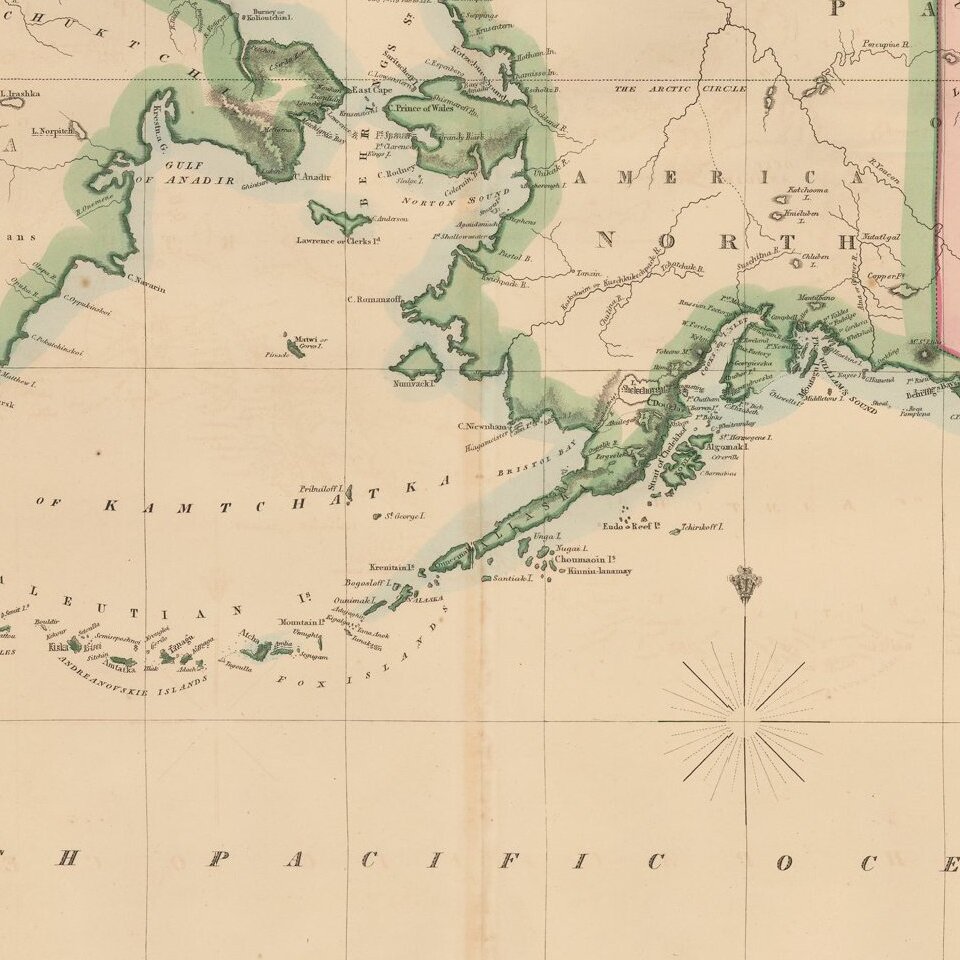 The detail in the interior is also of interest, especially the identification of Canadian Indian Tribes on either side of the MacKenzie River. The course of the Youcon (Yukon) River and Colville River are shown in the interior of Alaska, although relatively little else was known at the time. While the coastline of Alaska is quite well depicted, there are still a fair number of areas marked with dotted lines or otherwise inaccurately mapped.