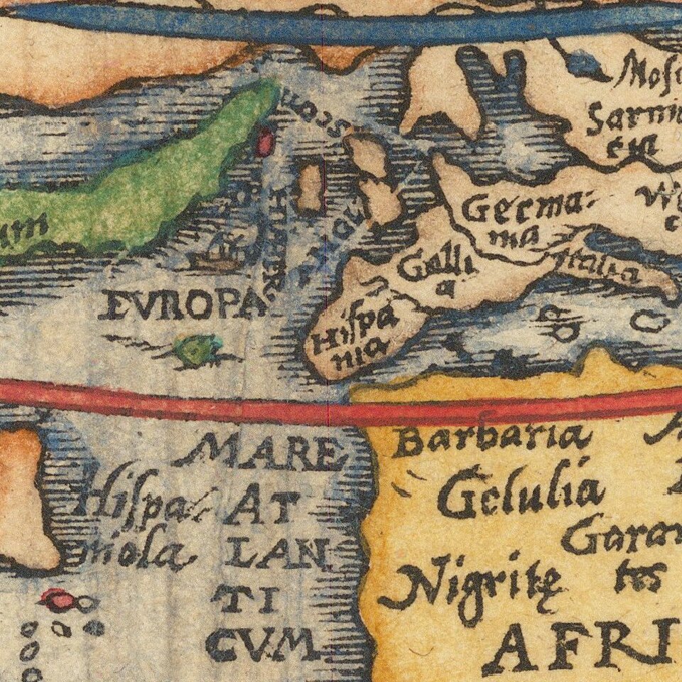 The map is bordered by signs of the zodiac and the Ptolemaic climatic zones. Zeus and Mars, wearing the coats of arms of Charles V, Holy Roman Emperor, are shown at the top of the map while wind-heads at the south represent the traditional believed plague-bearing nature of those winds. The map is highly decorative but also an important milestone in the history of cartography as it is one of the earliest maps to show a representation of America, or the name itself.