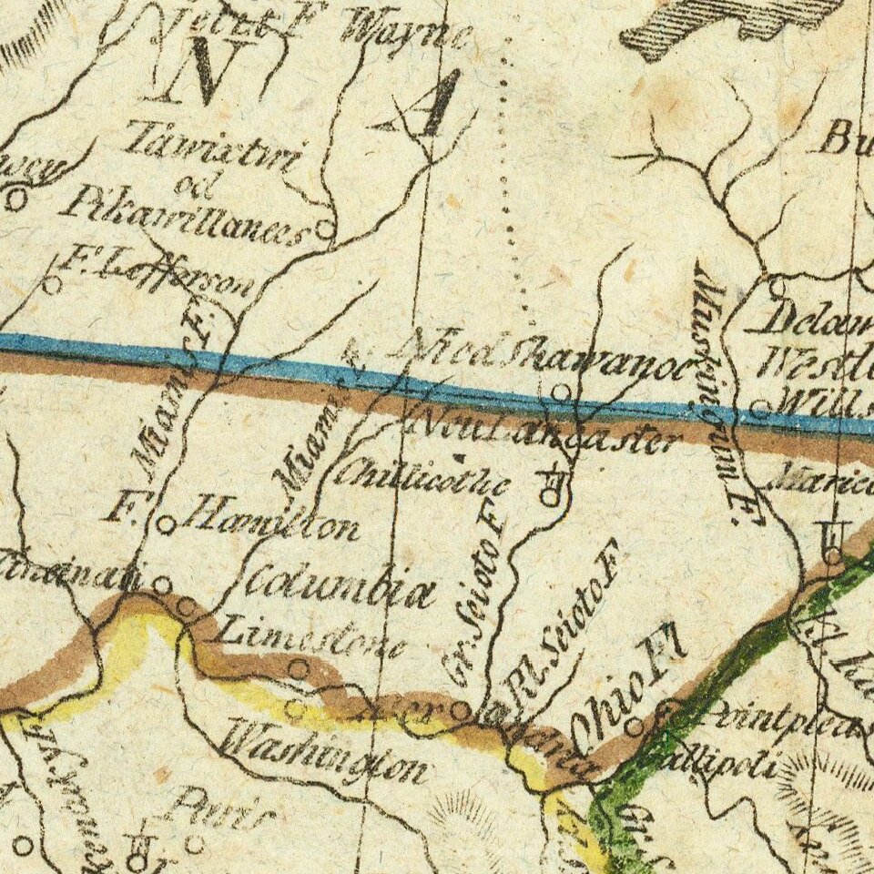 The configuration for Ohio and Indiana is very unusual for the period. Georgia is shown extending to the Mississippi River, the map not yet being updated for Mississippi and Alabama.