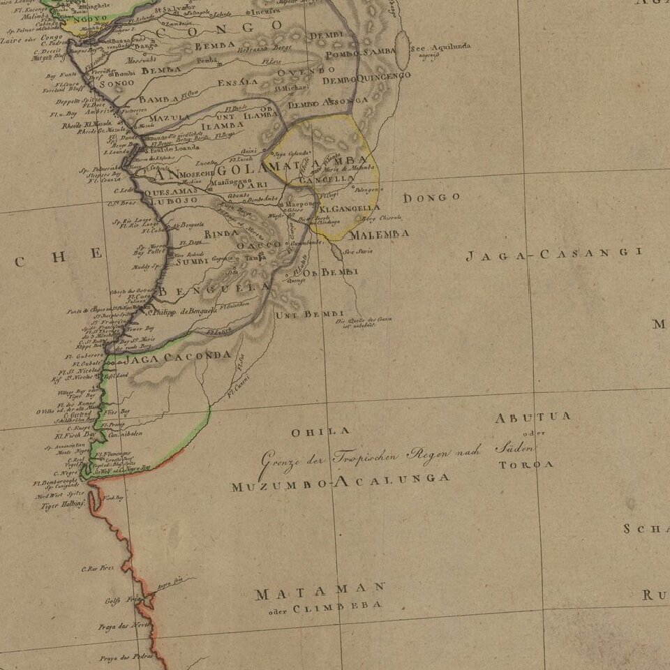 Fascinating German hand-colored engraved map of western central Africa, encompassing the Congo River Basin south to Angola.