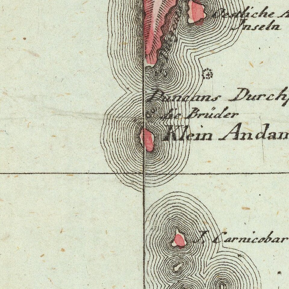 Islands are ringed by a series of lines, suggesting depth, but, in reality, they are a decorative embellishment. The scale, at lower right, contains five bars, which offer scales in German and English, but also Indian and Chinese measurements.