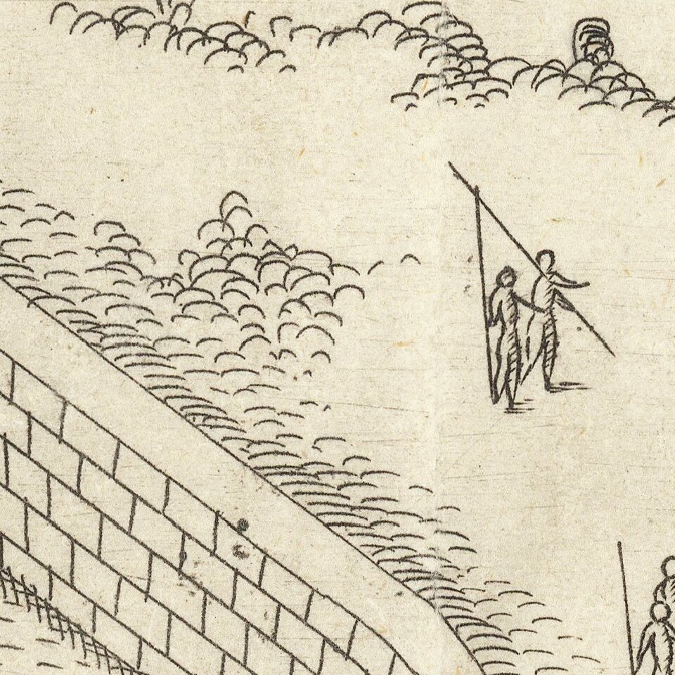 The fort itself is shown in the upper-right corner of the sheet. It is Houmt Souk, located in the north of the island. The fort has a series of walls meant to prevent land invasion, and the sea side is left open. An inlet from the sea fills a moat that surrounds the town at the center of the walls, and another moat guards the outer walls as well. Soldiers, some mounted, drill in the inner space between the walls and the town.
