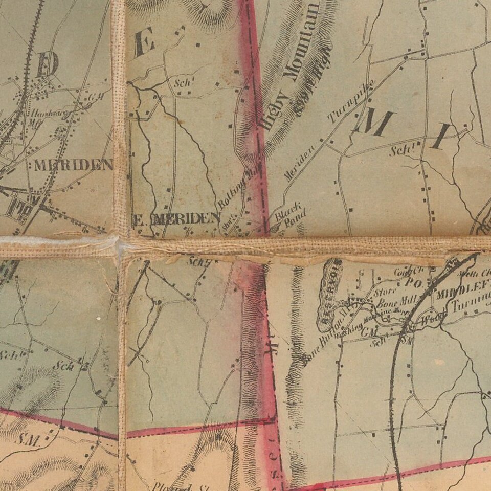 Hand-colored lithographed folding map of Connecticut, the most detailed and authoritative map of the state of its time. It includes topographical detail, is hand-colored by township and county, and shows railroads as well.