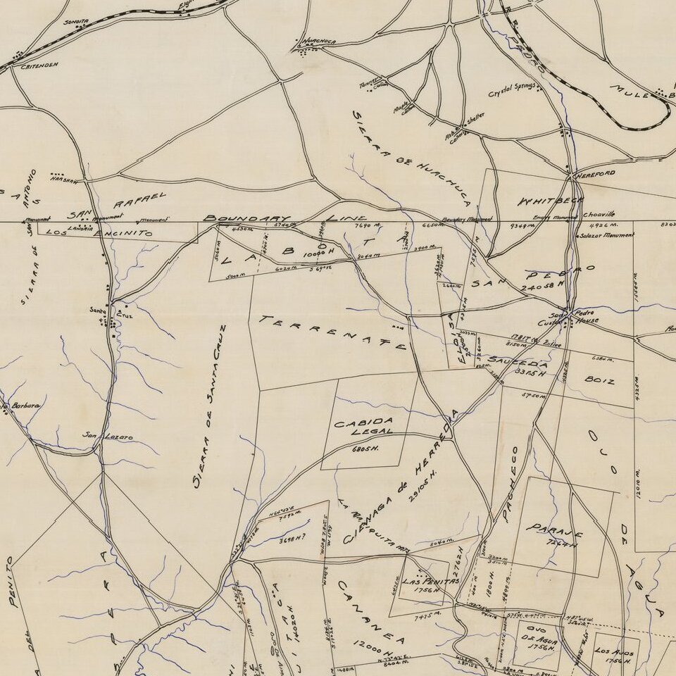 Detailed manuscript map of part of Southern Arizona and Northern Sonora, focusing on the Ranches of the California and Mexico Land and Cattle Company, likely drawn about the same time as the Cananea Strike and Massacre and just before the Mexican Revolution.
