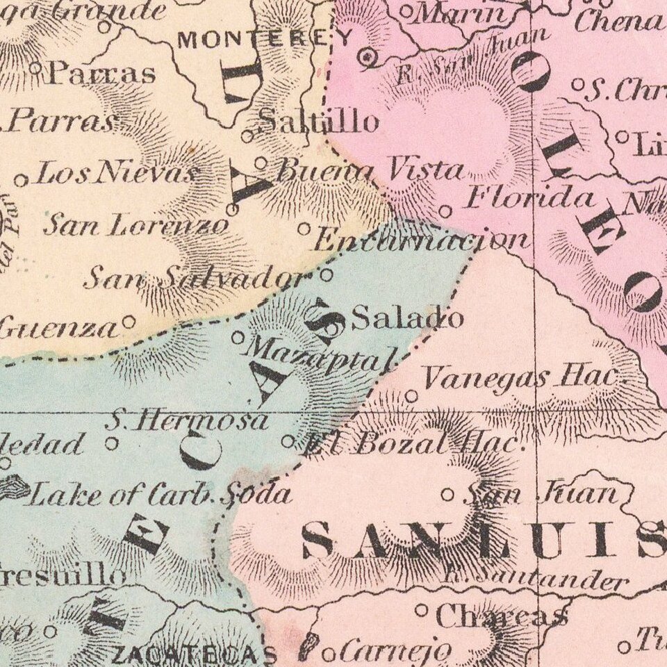 Very detailed map showing towns, counties, Gulf of Mexcico and Gulf of California with lovely decorative border and inset of Territory and Isthmus of Tehuantepec. An excellent pre-Civil War map. From the scarce 1859 edition of Colton's atlas, which is the first to include the imprint of Johnson & Browning, one year before these two publishers created their own New Illustrated Family Atlas of the World. Fine attractive color and decorative border.