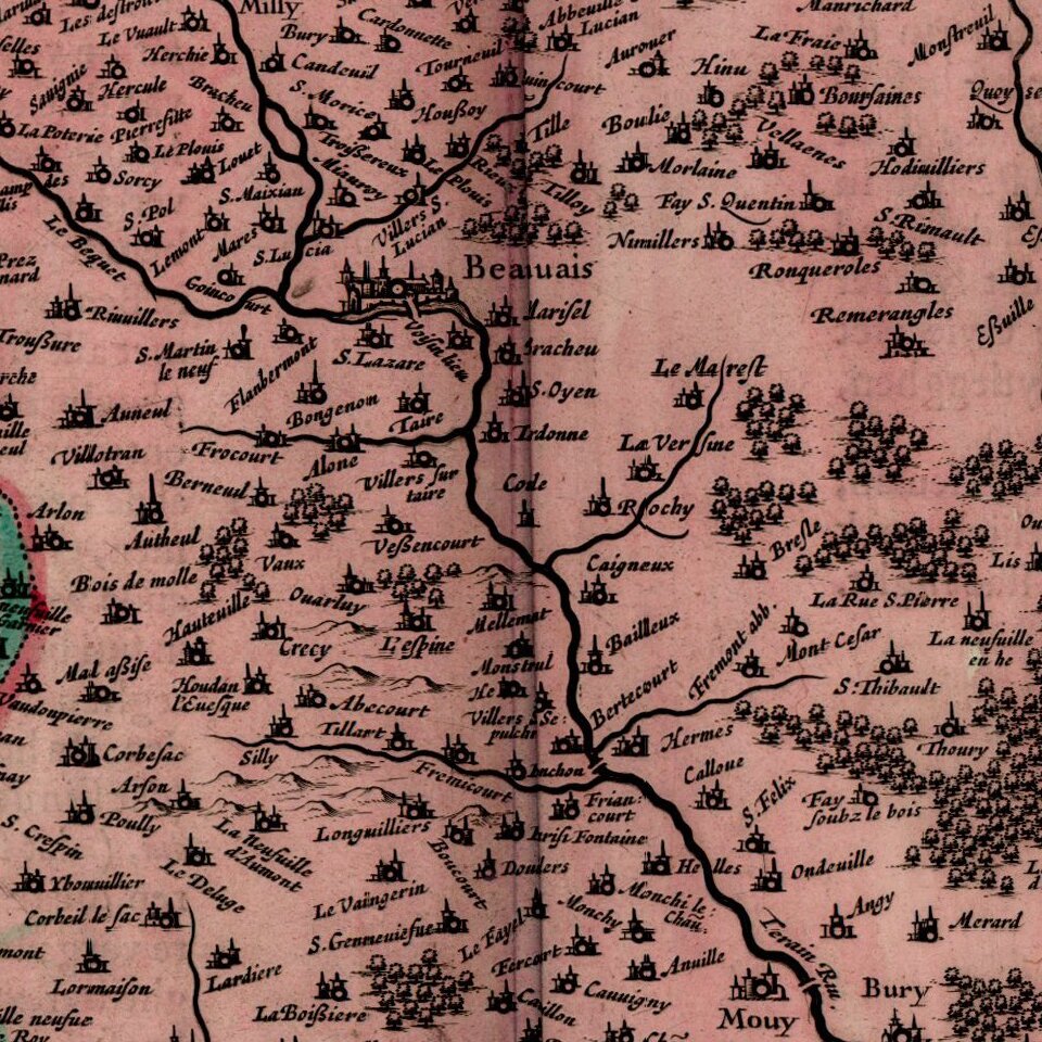 Attractive map of Beauvais region, showing Meulan, Pontoise, Compienge (Champagne), Milly and Beauvais.