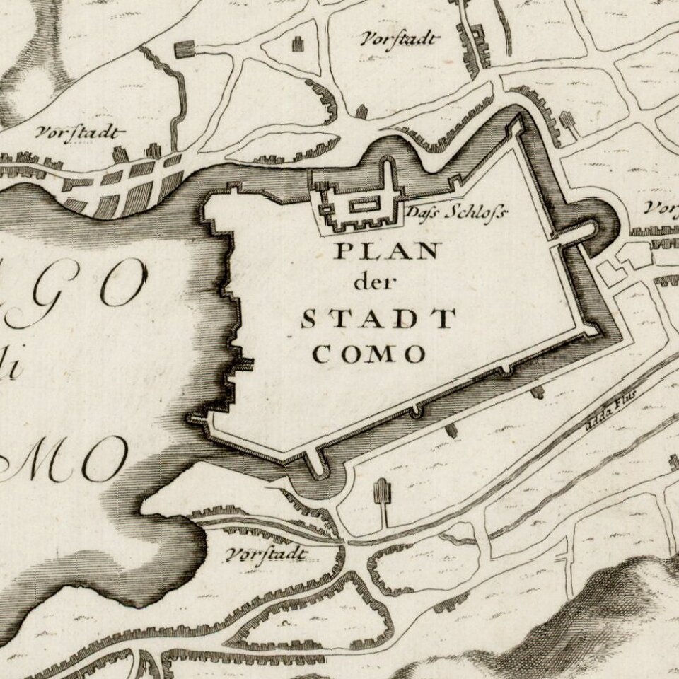 Detailed view and plan of the fortifications of the town of Como on the edge of Lago di Como, published by Gabriel Bodenehr.