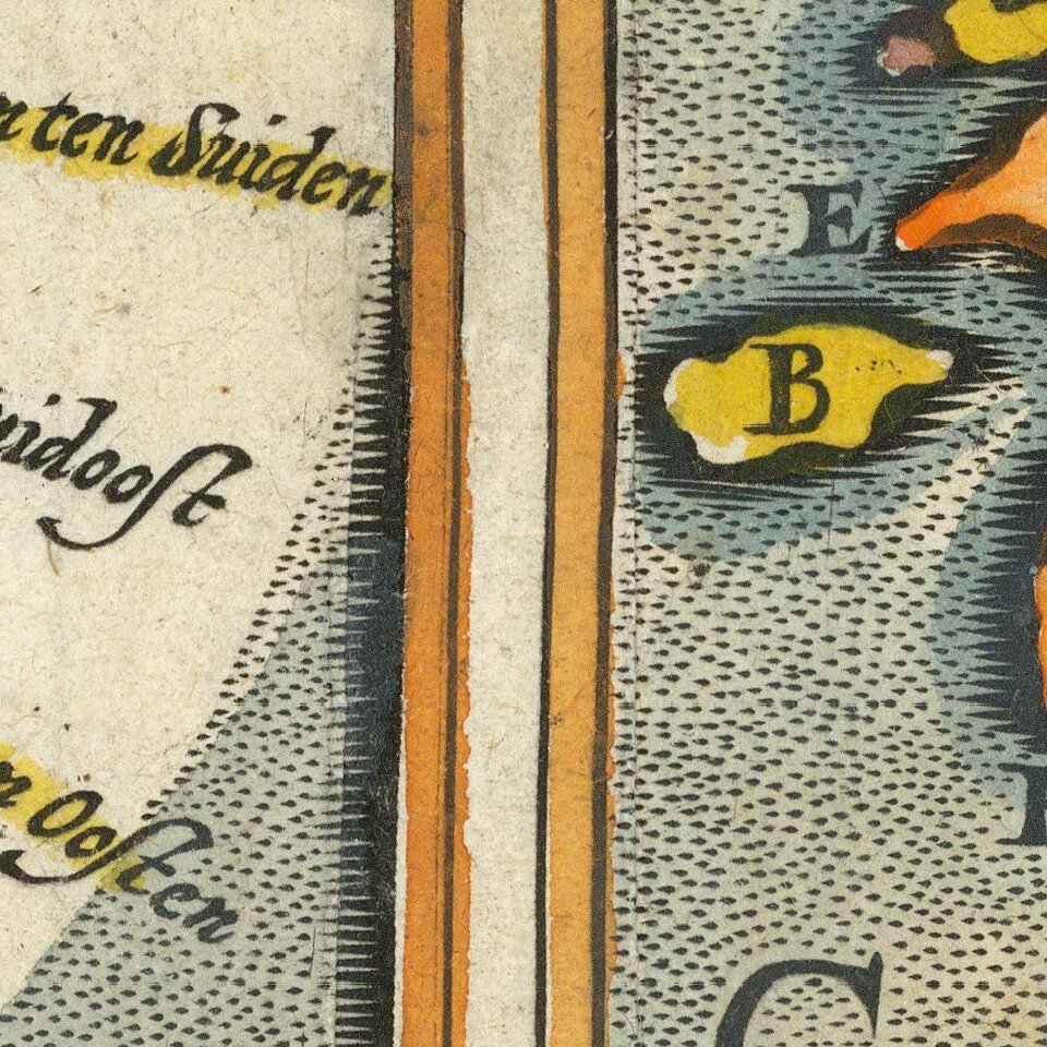 Matthias Quad (1557-1613), a map publisher based in Cologne, was trained in the Netherlands by Johannes van Doetecum, who also worked with the De Jodes. Quad used many De Jode maps as a base to which he added additional information and decorations. Quad was best known for his atlases, which were part of the first boom in atlases best characterized by Abraham Ortelius’ Theatrum Orbis Terrarum. In 1592, Quad released an atlas of Europe that had 38 maps. He expanded it in 1594 to 50 maps. In 1600, he expanded the collection of maps further still, this time to 82 maps, and called the atlas, Geographisch Handtbuch. All three were small in size, allowing them to compete as cheaper alternatives to the larger atlases of Ortelius, Mercator, and the De Jodes. Quad released one other atlas, in 1608, with 86 maps, the Fascilus Geographicus.