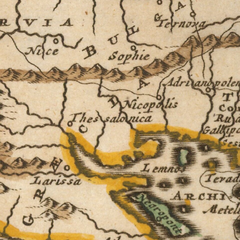Decorative map of the region bounded by Italy, Corsica, Sardinia and Sicily in the west and extending to Cyprus, Asia Minor and the Holy Land in the east. Centered on Greece and the Balkans.