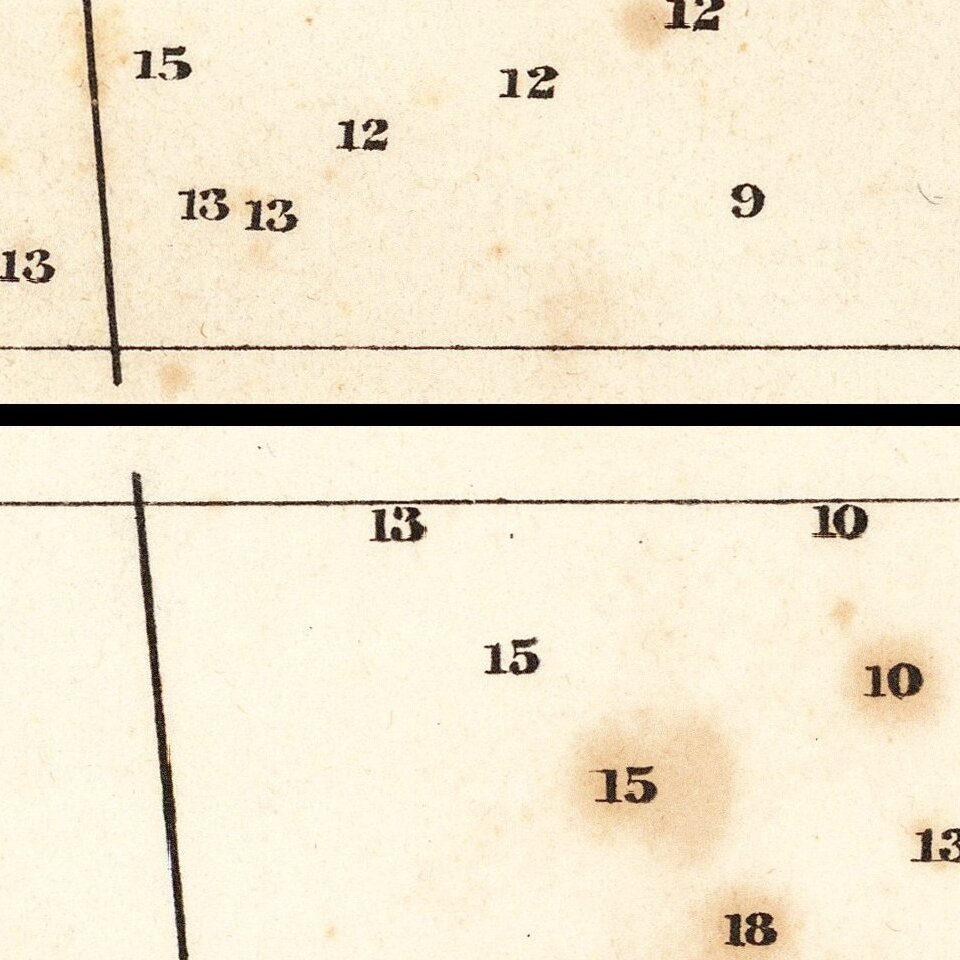The survey of Cape Fear resulted in the creation of several highly detailed charts of the River and Harbor, including the chart offered here (in 4 sheets), a chart of the Cape Fear River (92 x 21 inches) and a Continuation Chart of the Survey of the Cape Fear River. The resulting charts, along with others the areas surveyed around Beaufort, were apparently issued in a bound portfolio in 1843, although the present example of the map is signed by its makers as having been executed in December 1839. The area shown in this map includes Smithville (now South Port), the future Fort Fisher and the area at the south end of the modern Military Ocean Terminal-Sunny Point.