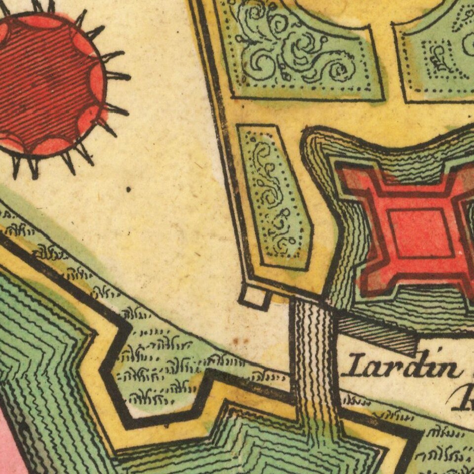 Oriented with southeast at the top, the map focuses on the town's fortifications.