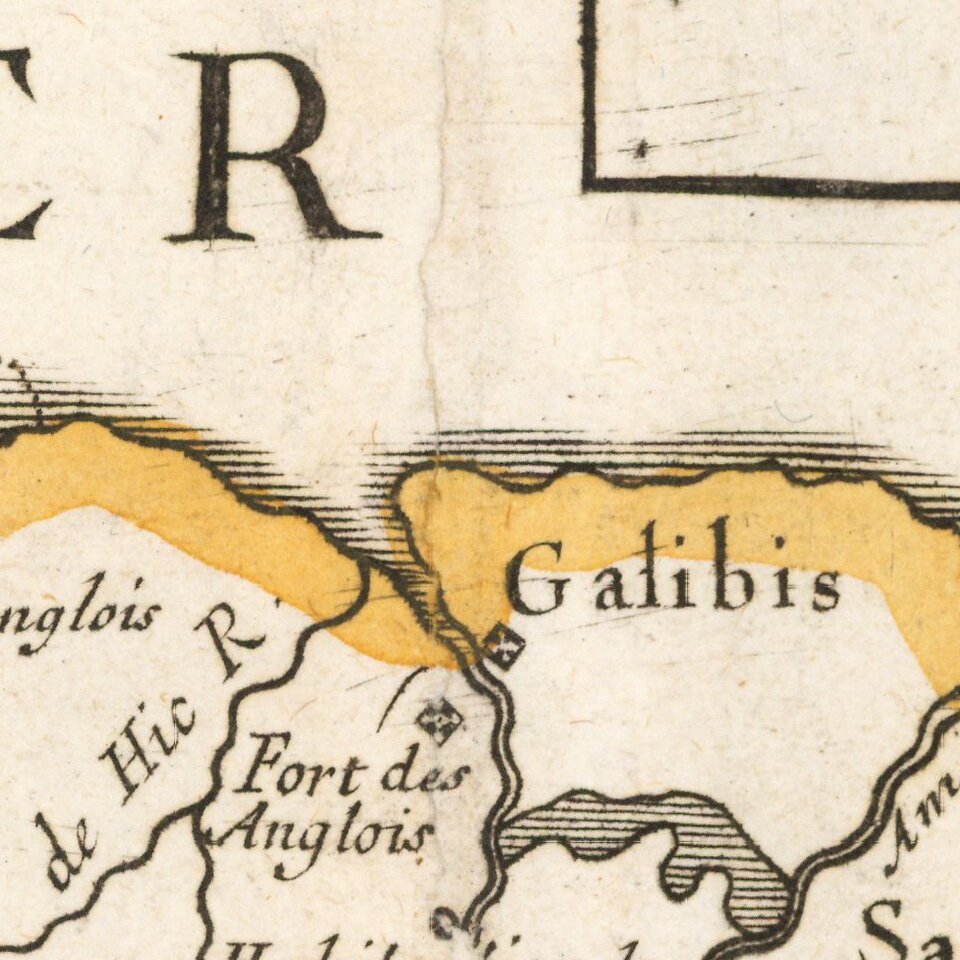 Very rare map of the Northeast coastline of South America, from the mouth of the Orinoco River to the mouth of the Amazon River, centered on Galibis, Sapayes and the Isle de Cayene.