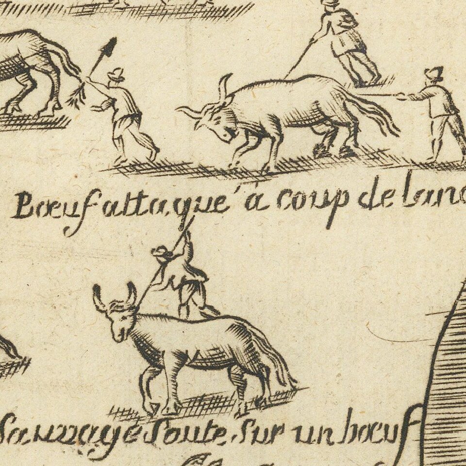 The present map shows one of a Crocodile at the top, along with methods of the local Indians hunting and cooking "Boeuf" (Buffalo).