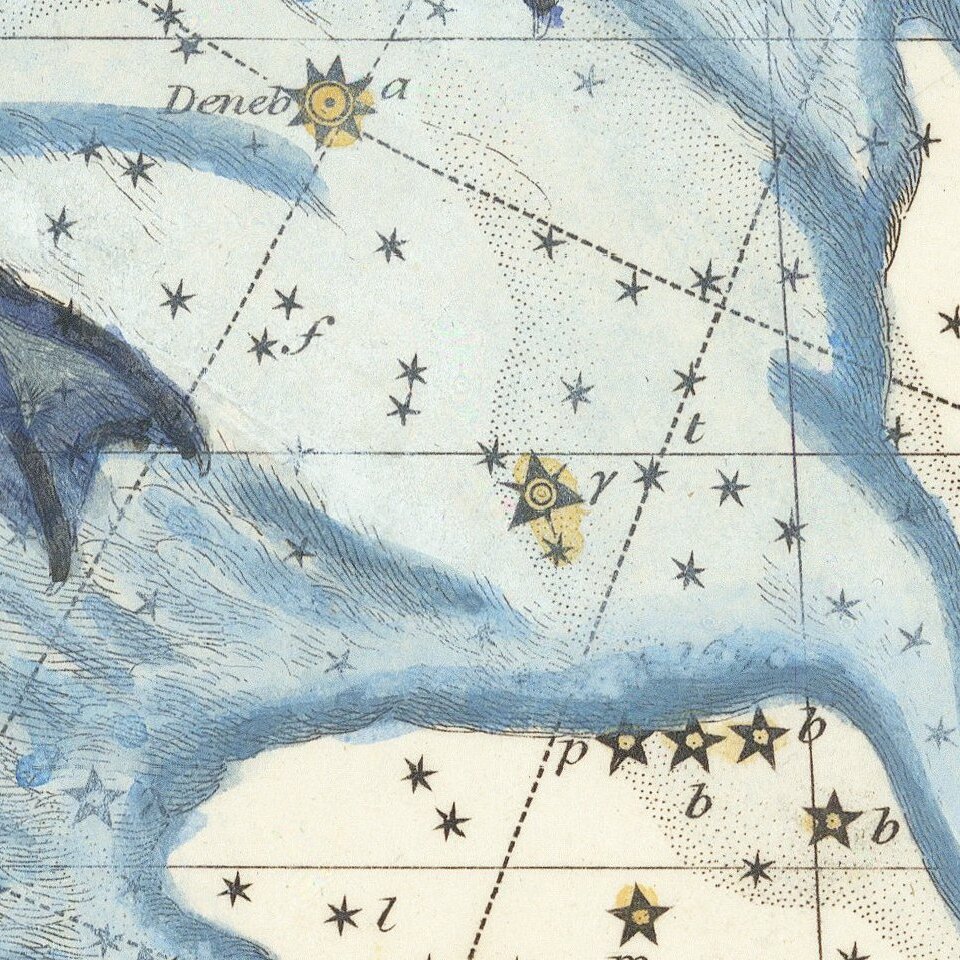 Striking star chart showing the constellations Cygnus, Lyra and Lacerta, marvelously engraved and delicately colored. Shows the featured constellations in color with neighboring stars and constellations without color.