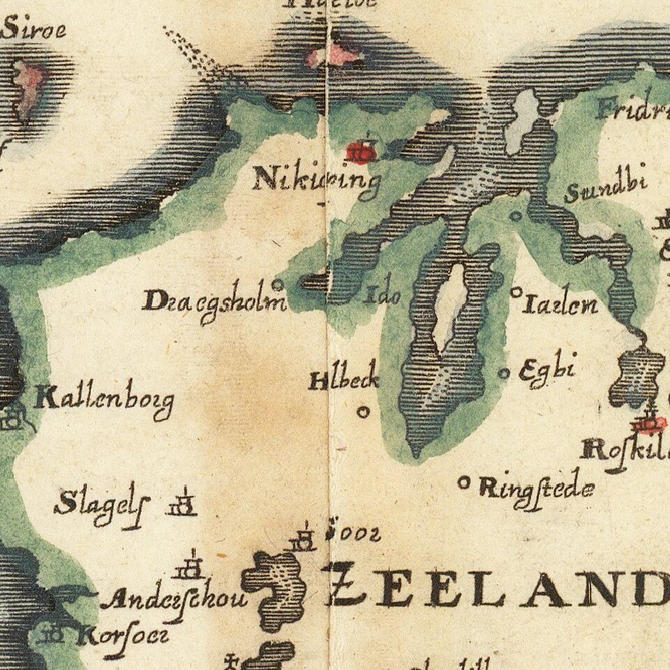 Decorative map of Denmark, from Merian's Neuwe Archontologica Cosmica . . ., published in 1638.