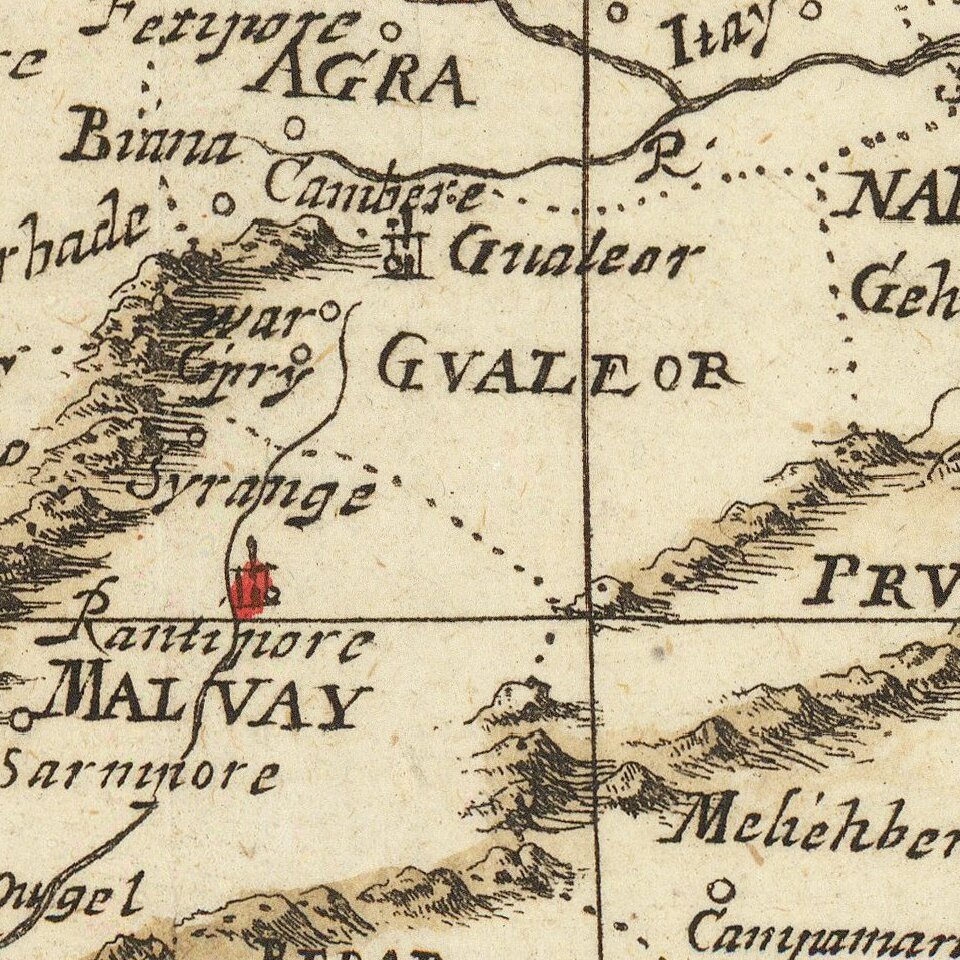 Almost all of the land shown on the map would have been ruled by the Mughal Empire at the time. Akbar, Babur, Humayun, and several other great early leaders had expanded this empire from Kabul eastwards through various wars and campaigns. The empire thrived for nearly two centuries, which is where it stood at the time this map was made. By 1686 some cracks were already present in the leadership as Aurangzeb, the leader at the time, had conservative tendencies and cracked down on the religiously and culturally tolerant policies which helped the empire thrive. Open revolts were common by his death in 1707, and the empire was never again able to regain its control.