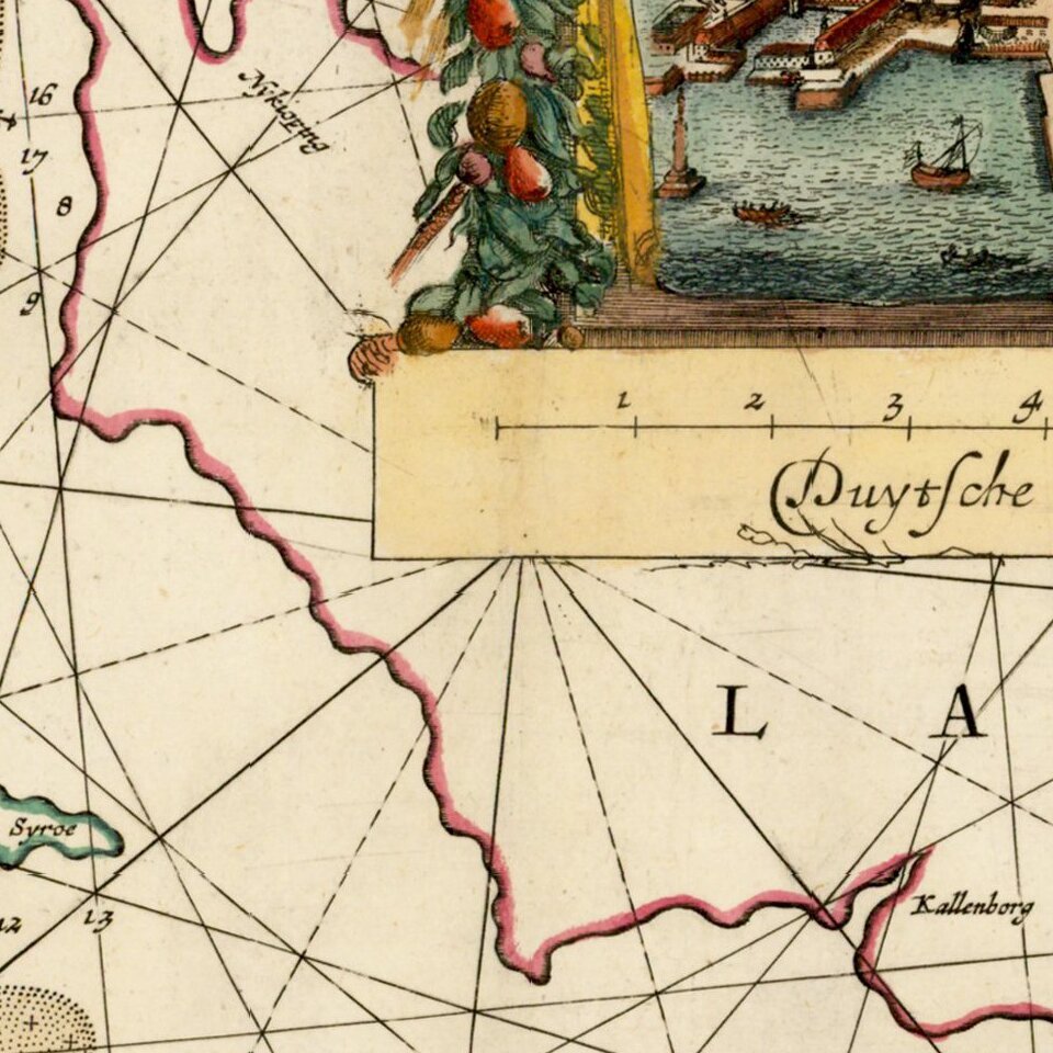 Apart from its rarity, the Zee-Atlas was of importance for its inclusion of the earliest Dutch sea chart of the New Netherlands to appear in an atlas (Jacob Theunisz Lootsman's chart is believed to pre-date it, but seems not to have been regularly published until later), while the "three charts of the oceans are on the same scale (1:14mill.) as Portuguese and Spanish charts of that time. It marked the first time that such charts were published as atlas sheets" (Koeman IV, p.115).