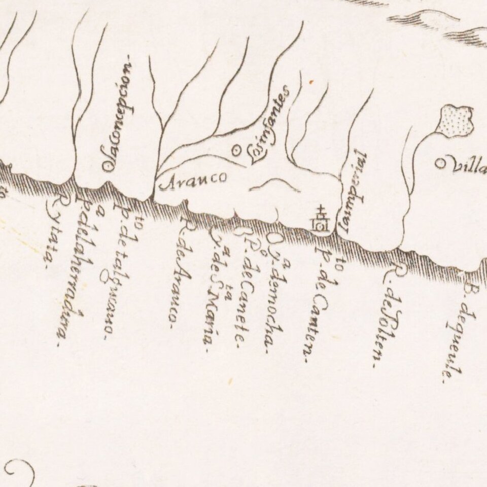 Rare early map of the province of Chile, locating rivers and settlements, the earliest map to include information from the previously secret manuscript maps of the Spanish cosmographer, Juan López de Velasco.