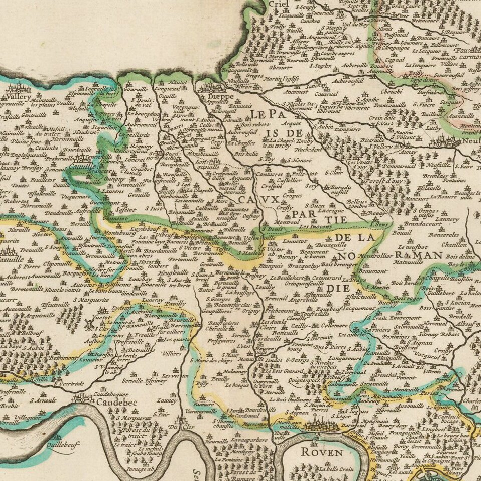 Rare map of a portion of Normandy, engraved by Salomon Rogers.