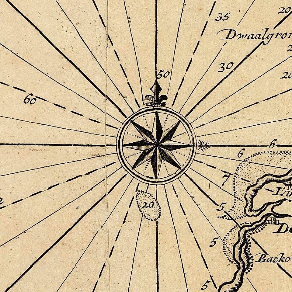 In the upper left, a reference is made to the changing variation of the magnetic compass in the area depicted. It also refers to the Dutch custom of manufacturing "normal" compasses (compass card magnets and North pointer lined-up) and also those used for the local area close to Holland, where the north pointer was off-set from the compass card by a fixed amount (half a point), allowing the user to steer a truer course directly on the magnetic compass. The Dutch also used compasses with an adjustable off-set to be able to adjust the compass variation off-set to the values established en-route. (We wish to thank Hans Kok, co-author of Sailing for the East, History & Catalogue of Manuscript Charts on Vellum of the Dutch East India Company (VOC) 1602-1799, for providing the information and translation). While Loots, in his lifetime, was a prolific chart maker, very few of his charts have survived to modern times, almost certainly because the vast majority of the charts were used by mariners at sea.