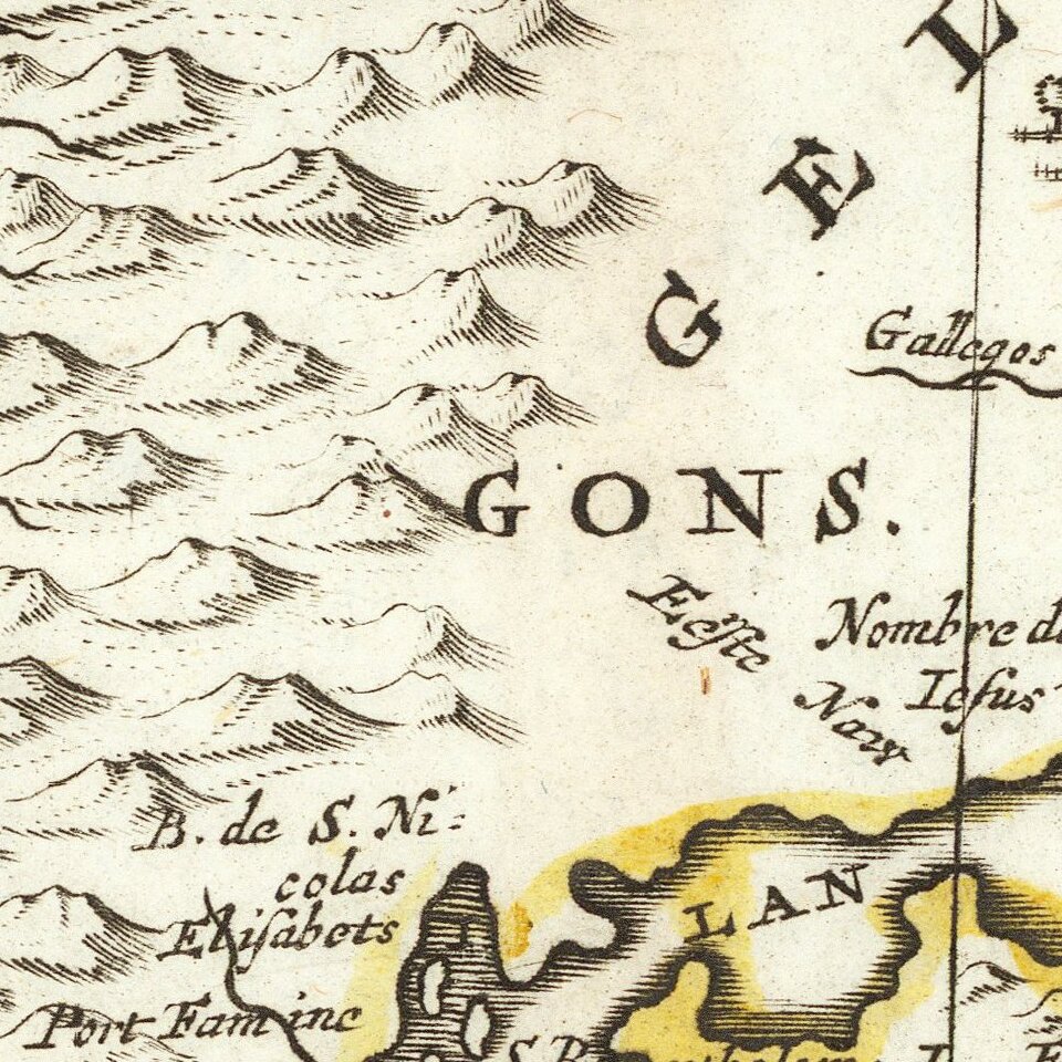 Fine example of Sanson's early regional map of the southern tip of South America, from P. de las Baixas and Port Desire in the east and the southern portion of Chile in the west, showing Magellanica in remarkable detail, including Staten land, Destroit de Browers, Cape Horn, Diego Ramirez, and many other points, capes, islands, straits, etc.