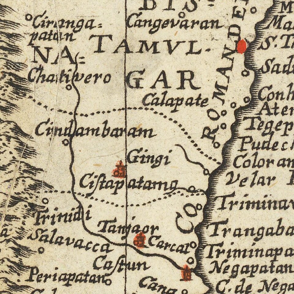 The map alludes to the fact that Nageptnam had been a major Portuguese trading center in Coromandel until it was handed over to the Dutch in 1676. The city became the capital of Dutch Coromandel in 1690. The city shows many Dutch vessels and Dutch flags flying overhead.