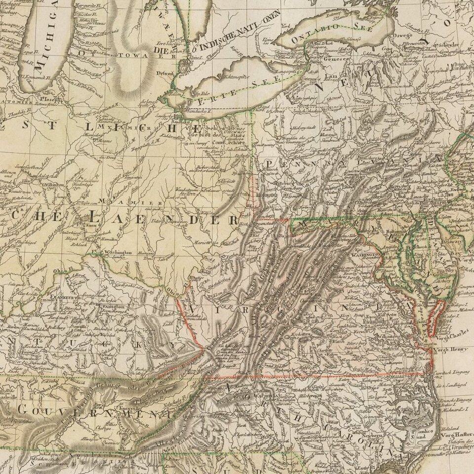 In 1795, Ebeling recognized the need for an Atlas volume and began compiling his Atlas von Norkamerika. The plan was for 18 maps, 16 of which would be separate states. Of the 18 maps, only 10 are known to have been issued and there are only a handful of complete sets known.