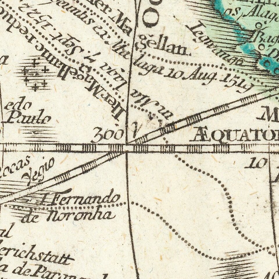 Dotted lines crisscrossing both hemispheres, not present in Allard’s original map, trace important voyages of European encounter. One line traces Ferdinand Magellan’s quest to find a westward route to the Spice Islands via the southern tip of South America, departing Malaga, Spain, in August 1519, and returning (after the death of Magellan and much of the crew) in September 1522. Another important voyage traced is that of Abel Tasman in 1642 to Oceania, including observation of parts of the Australian coastline and the first European encounter with New Zealand.