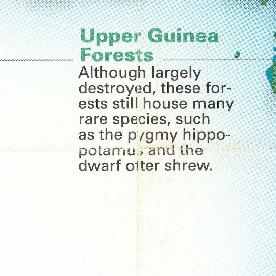 Fascinating pictorial map that portrays the many unique aspects of life on earth. Map itself portrays the world divided into biomes. Insets detail the differences in summer and winter primary productivity between the hemispheres. Includes drawings of species endemic to various parts of the world, from the Corsican Red Deer to the Spectacled Bear. Extensive notes on areas of particular interest, such as Lake Baikal or Andean forests.