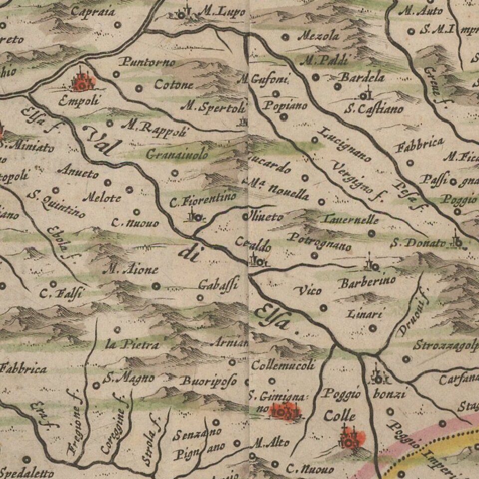 Gorgeous old color example of Jansson's map of Fiorentino, centered on Florence.
