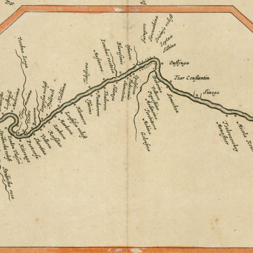 The headwaters are at bottom left, with the mouth at Archangelsk at upper right. The map is decorated with a superb title cartouche surrounded by putti and a distance scale flanked by wildlife.
