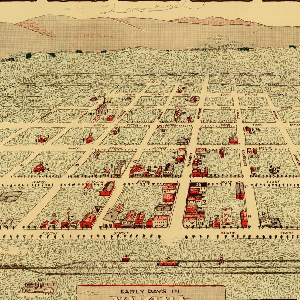 The view shows a plan of the City, naming streets and identifying 67 early structures. The map is surrounded by views of early buildings, including the Block House at Ft. Simcoe (1856), J P Mattoon Cabin (1870), the oldest surviving house in Yakima, and a number buildings which then existed in 1885, along with other indigenous scenes.