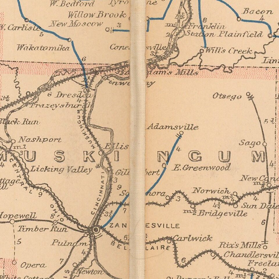 The present map, representing the Eastern half of this wall map provides the best possible snapshot of the operations of the Postal Service within the State of Ohio and continguous regions as of 1885.
