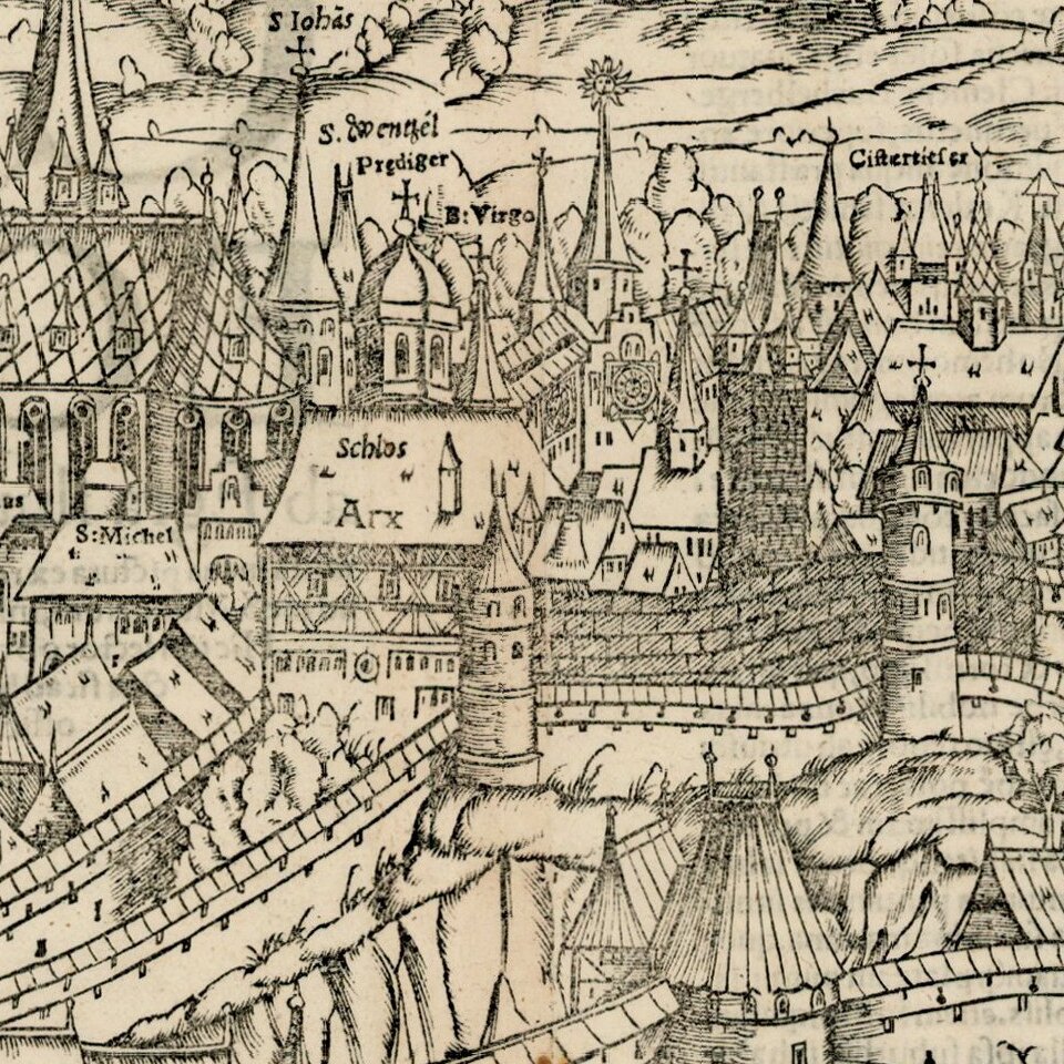 Important early view of the walled town of Eger, or Cheb, in the Czech Republic, including the city's coat of arms and the prominently labeled Church of Saint Nicholas.