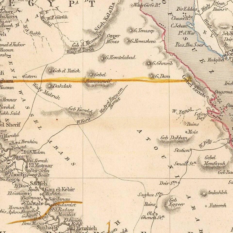 Gorgeous full color example, with large vignettes showing the Mosque of the Sultan Hassan, Alexandria, Ruins of the Great Temple Karnac, Great Sphinx, Ghizeh and sail boats in the Red Sea.