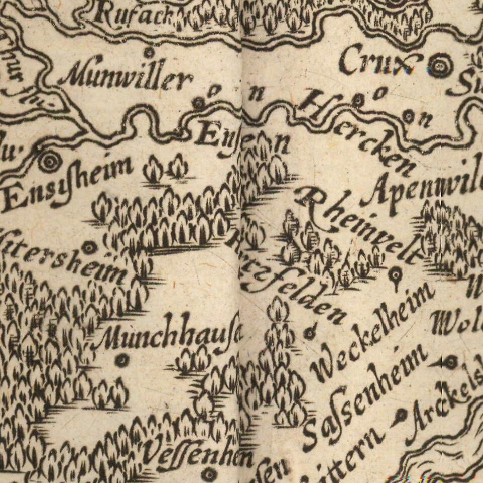 Nice example of this scarce map of the river traversed by the Rhine River, between Basel and regions to the North, published in Cologne.