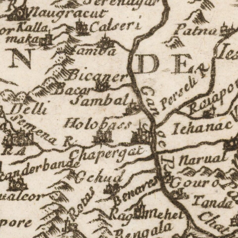 Detailed map of the Mogol Empire, centered on the Ganges River, published in Paris by Du Val.