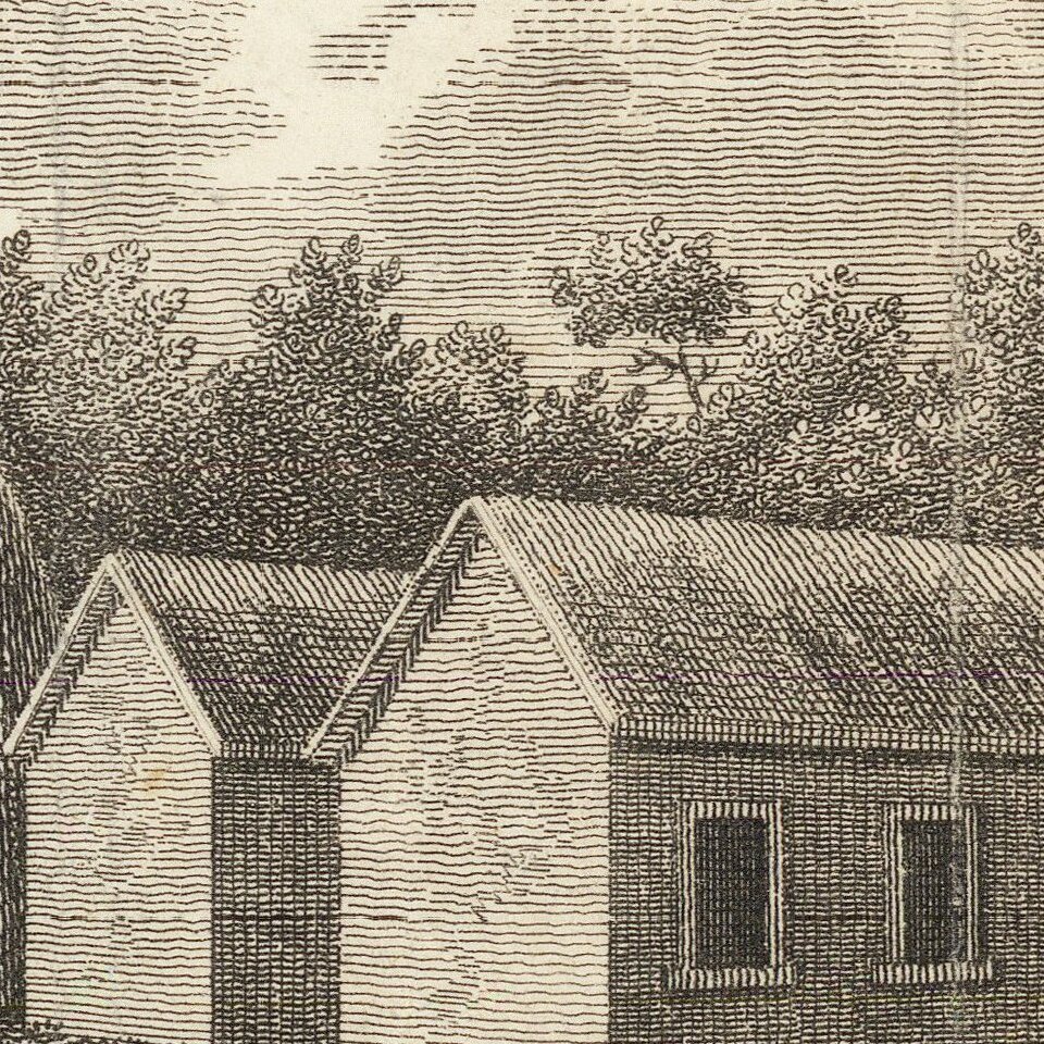Copper plate engraved image of a plantation in South Africa, from New travels into the interior parts of Africa, by the way of the Cape of Good Hope, in the years 1783, 84 and 85. . . . by Francois Valliant.