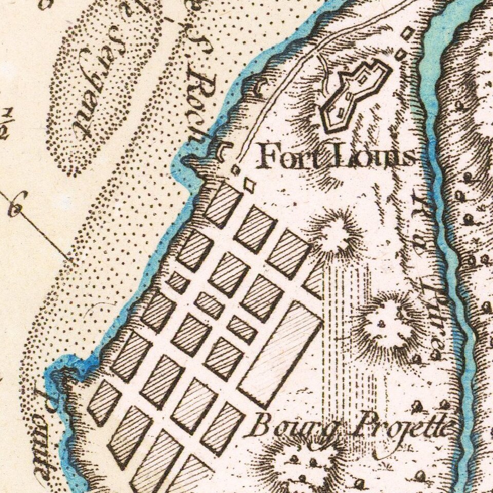 Detailed map of the environs of Fort Louis on the island of Guadalupe.