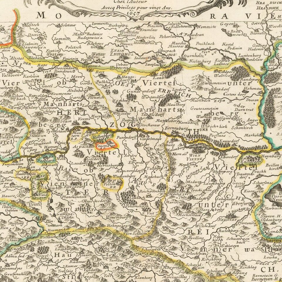 Nicolas Sanons' double-page engraved map of part of Austria, centered on the course of the Donau River. The map was published in Paris in 1657.